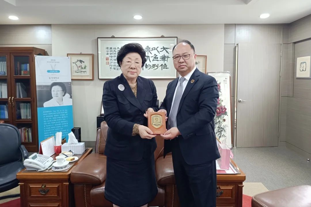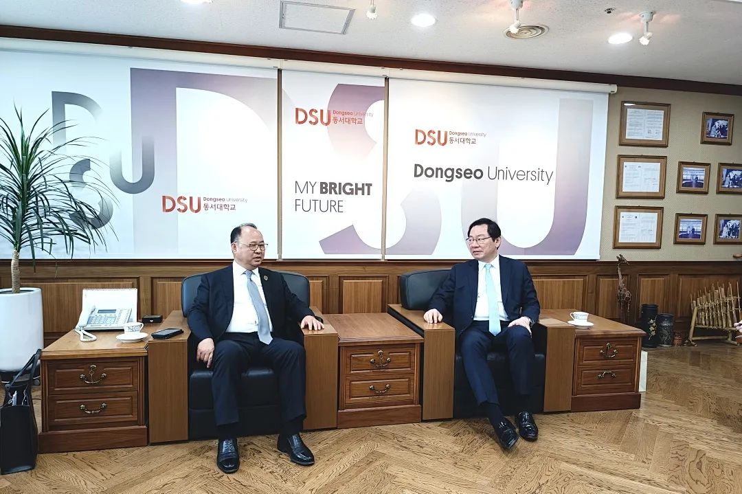 展会期间,郑立国赴韩国东西大学交流访问,与东西学园董事长朴东顺、东西大学校长张济国等人座谈,并就两校间师生交流、联合项目创作、联合创业等方面的合作进行了深入探讨。