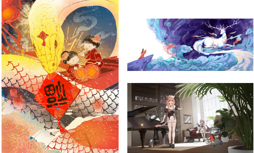 获得金奖的作品中,《金蛇守护》以一条蜿蜒盘旋的金色大蛇为画面中心,灵动的线条与明艳的色彩将蛇的威严与灵动展现得淋漓尽致,象征着蛇年的繁荣与吉祥;《云梦泽》则以古籍《山海经》为蓝本,用极具古韵的线条笔触描绘神兽白泽,细腻勾勒出白泽的神秘形态,尽显独特的东方美学魅力;在《午后》中,画面仿佛是一首欢快的乐章,暖色调的阳光肆意倾洒,洋溢着青春活力的少女与憨态可掬的召唤兽彼此呼应,完美融合,共同展现出一段充满奇幻与欢乐的午后时光 。