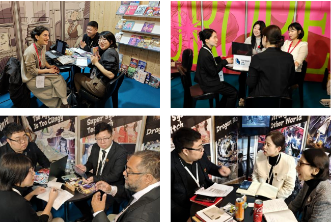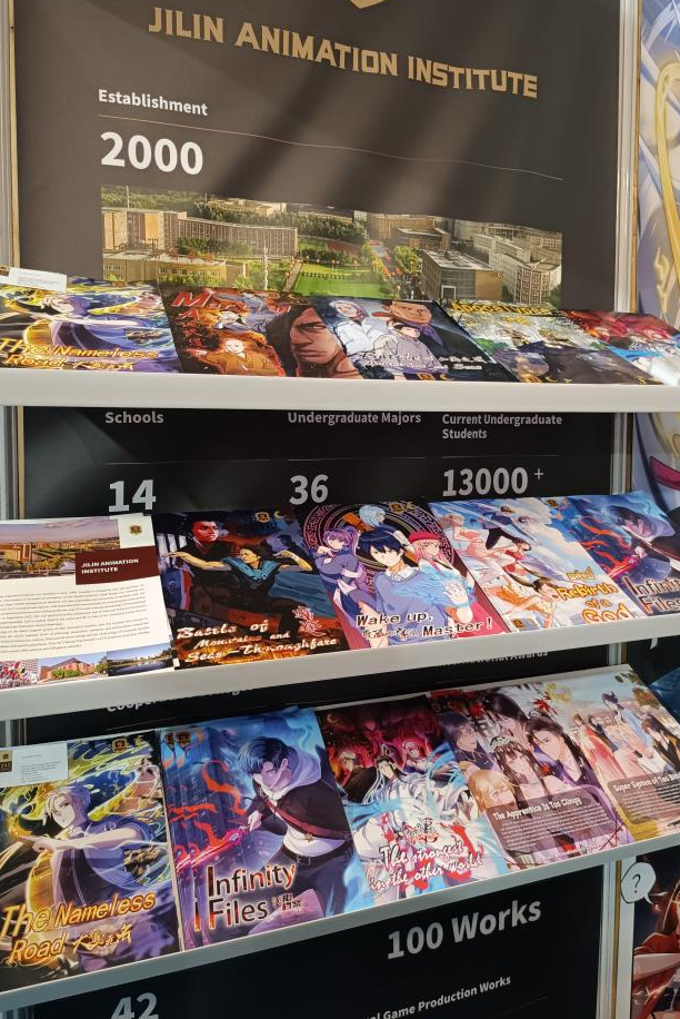 此次是吉林动画学院第三次受邀参展,并在国际版权市场设立独立展位,通过多媒体视频互动、线下实体书、IP内容展示、版权洽谈等多种形式,向来自35个国家和地区的参展商代表展示了学校在动画、漫画、游戏、影视、衍生品等IP所取得的优秀成果,重点推介《大道无名》《异界最强》等18部漫画作品。我校代表与来自法国、巴西、美国、西班牙、意大利、菲律宾等国家、地区的30余家出版商、漫画创作公司分别就漫画IP引进、版权授权、联合创作、国际招聘等进行洽谈。