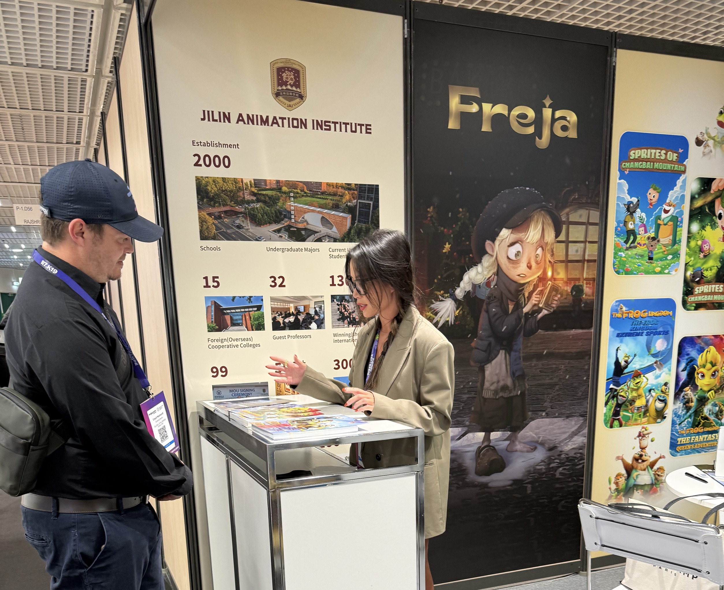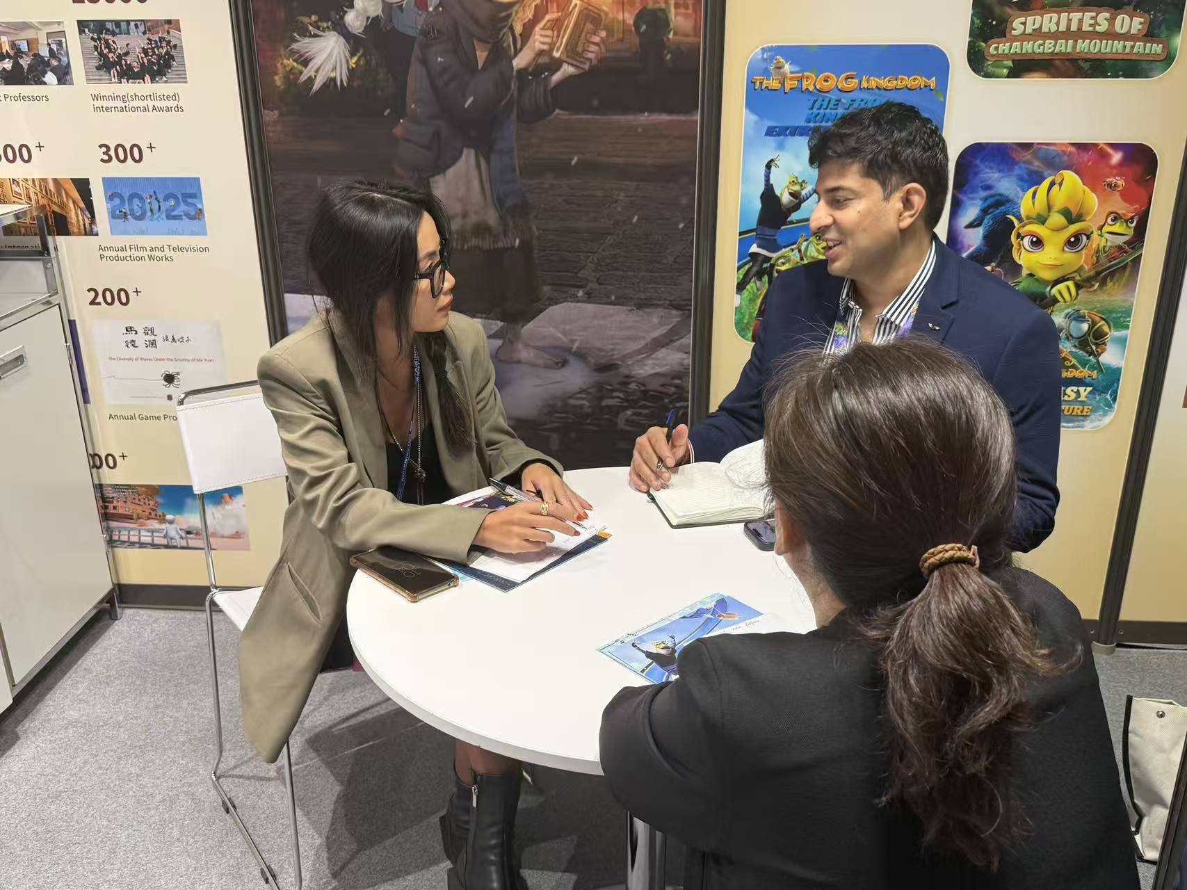 活动现场,吉林动画学院代表团与来自美国、法国、西班牙、加拿大、新加坡、印度等国家和地区的三十余家知名企业,围绕影视内容海外发行、AI数字制作技术应用等多个核心领域展开深入洽谈,达成多项合作意向,为师生原创作品开辟海外传播新渠道。同时,为学校精准对接国际产业资源、优化国际化办学生态、提升国际竞争力奠定了坚实基础。